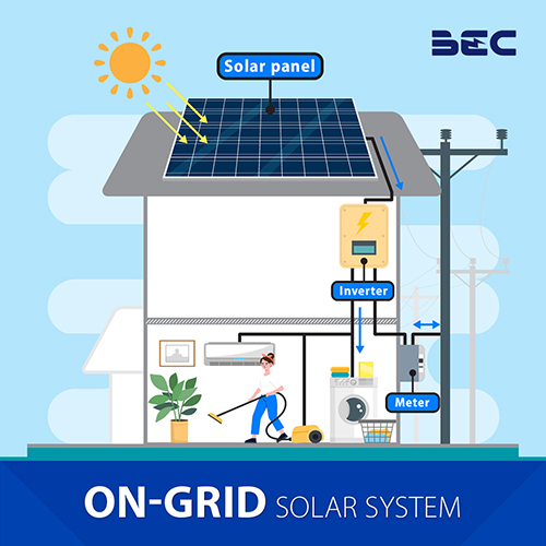 ระบบออนกริดไม่ต้องใช้แบตเตอรี่ เนื่องจากระบบนี้จะเชื่อมต่อกับการไฟฟ้า โดยมีการใช้ไฟจากโซล่าเซลล์และไฟจากการไฟฟ้า ระบบนี้จะมีไฟใช้ตลอดเวลา เพราะไฟฟ้าจากระบบการไฟฟ้าหรือไฟบ้าน จะไหลเข้ามาเสริมพลังงานจาก solar cell ที่หายไปตลอดเวลา ไฟฟ้าที่ผลิตเหลือจากการใช้ในแต่ละวัน สามารถขายคืนให้กับทางภาครัฐได้ ทางผู้ใช้จะต้องทำสัญญากับทางภาครัฐตามขั้นตอน