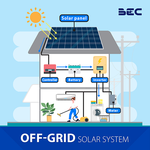 ระบบออฟกริดจะไม่เชื่อมต่อกับสายของการไฟฟ้าฯ เหมาะสำหรับพื้นที่ที่การไฟฟ้าเข้าไม่ถึง หรือต้องการใช้เพื่อสำรองไฟไว้ใช้เมื่อยามที่ไฟฟ้าดับ สามารถใช้ร่วมกับแบตเตอรี่หรือไม่ร่วมกับแบตเตอรี่ก็ได้ ขึ้นอยู่กับการใช้งานของผู้ใช้งาน ในกรณีที่ใช้ร่วมกับแบตเตอรี่กระแสไฟฟ้าจะไหลผ่านตัว Charge controller เพื่อเก็บกระแสไฟฟ้าไว้ในแบตเตอรี่ ในช่วงกลางวันที่มีแสงอาทิตย์เพียงพอ