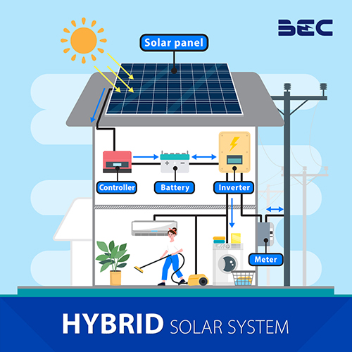 ระบบนี้คือการนำเอาระบบออฟกริดและระบบออนกริดเข้ามารวมกัน ระบบไฮบริดนี้มีความเสถียรมาก เนื่องจากเสมือนมีแหล่งจ่ายไฟ 3 แหล่ง (โซล่าเซลล์ + แบตเตอรี่ + ไฟฟ้าจากการไฟฟ้า) คอยช่วยกันจ่ายไฟ หน้าที่ของแบตเตอรี่จะมาช่วยสำรองพลังงาน เมื่อแผงโซล่าร์เซลล์ได้รับพลังงานแสงอาทิตย์ จะแปลงเป็นพลังงานไฟฟ้ากระแสตรง (DC) แล้วส่งต่อมายังไฮบริดอินเวอร์เตอร์ ซึ่งไฮบริดอินเวอร์เตอร์ก็แปลงเป็นไฟฟ้ากระแสสลับ (AC) ซึ่งก็จะเชื่อมต่อกับระบบจำหน่ายไฟของการไฟฟ้าฯ และอีกขั้วหนึ่งก็ต่อเข้ากับแบตเตอรี่