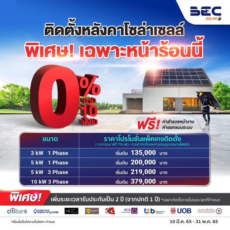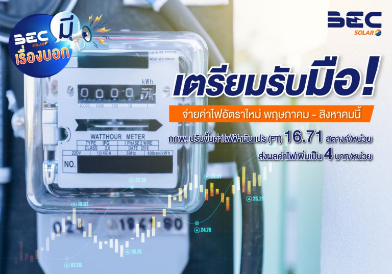 แต่ไม่ต้องกังวลไปค่ะ วันนี้ BEC Solar มีตัวช่วยดีๆที่จะช่วยลดค่าไฟฟ้า ในระยะยาวได้แบบสบายหายห่วงนั่นคือการเลือกติดตั้งระบบหลังคาโซล่าเซลล์หรือที่เรียกกันว่า โซล่ารูฟ นั่นเองค่ะติดตั้งครั้งเดียว ประหยัดไฟได้ยาวๆแถมไม่ถึง 5 ปีแรก ก็คืนทุนได้แล้วหมายถึง ตั้งแต่ปีที่ 5 เป็นต้นไปท่านเจ้าของบ้านที่เลือกติดหลังคาโซล่าเซลล์จะจ่ายค่าไฟน้อยลงมากๆ เพราะไฟฟ้าส่วนใหญ่ที่ใช้ในตอนกลางวันแสงอาทิตย์และแผงโซล่าเซลล์ ได้จ่ายค่าไฟให้ท่านแทนแล้วนั่นเองยังไม่รวมถึงปัจจัยที่ว่า อีกไม่กี่ปีข้างหน้าเราย่อมเลี่ยงไม่ได้ ที่ต้องพบวิกฤติเงินเฟ้อข้าวของทุกอย่างแพงขึ้น ขณะที่รายรับอาจจะสวนทางกันนั่นแปลว่า ยิ่งติดตั้งเร็วเท่าไหร่เราจะยิ่งคุ้มค่า และประหยัดค่าใช้จ่ายเร็วขึ้นเท่านั้น