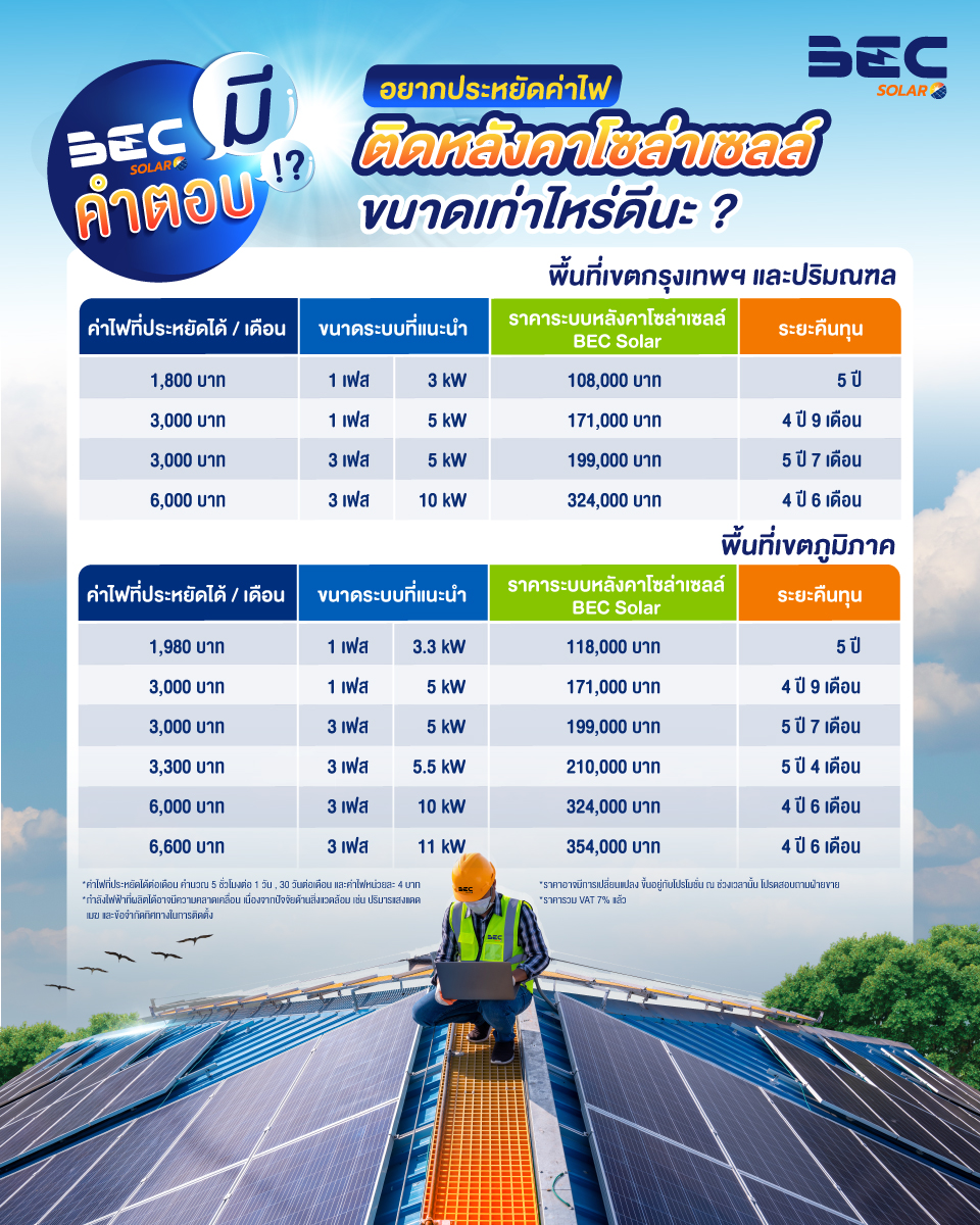 แต่ไม่ต้องกังวลไปค่ะ วันนี้ BEC Solar มีตัวช่วยดีๆที่จะช่วยลดค่าไฟฟ้า ในระยะยาวได้แบบสบายหายห่วงนั่นคือการเลือกติดตั้งระบบหลังคาโซล่าเซลล์หรือที่เรียกกันว่า โซล่ารูฟ นั่นเองค่ะติดตั้งครั้งเดียว ประหยัดไฟได้ยาวๆแถมไม่ถึง 5 ปีแรก ก็คืนทุนได้แล้วหมายถึง ตั้งแต่ปีที่ 5 เป็นต้นไปท่านเจ้าของบ้านที่เลือกติดหลังคาโซล่าเซลล์จะจ่ายค่าไฟน้อยลงมากๆ เพราะไฟฟ้าส่วนใหญ่ที่ใช้ในตอนกลางวันแสงอาทิตย์และแผงโซล่าเซลล์ ได้จ่ายค่าไฟให้ท่านแทนแล้วนั่นเองยังไม่รวมถึงปัจจัยที่ว่า อีกไม่กี่ปีข้างหน้าเราย่อมเลี่ยงไม่ได้ ที่ต้องพบวิกฤติเงินเฟ้อข้าวของทุกอย่างแพงขึ้น ขณะที่รายรับอาจจะสวนทางกันนั่นแปลว่า ยิ่งติดตั้งเร็วเท่าไหร่เราจะยิ่งคุ้มค่า และประหยัดค่าใช้จ่ายเร็วขึ้นเท่านั้น