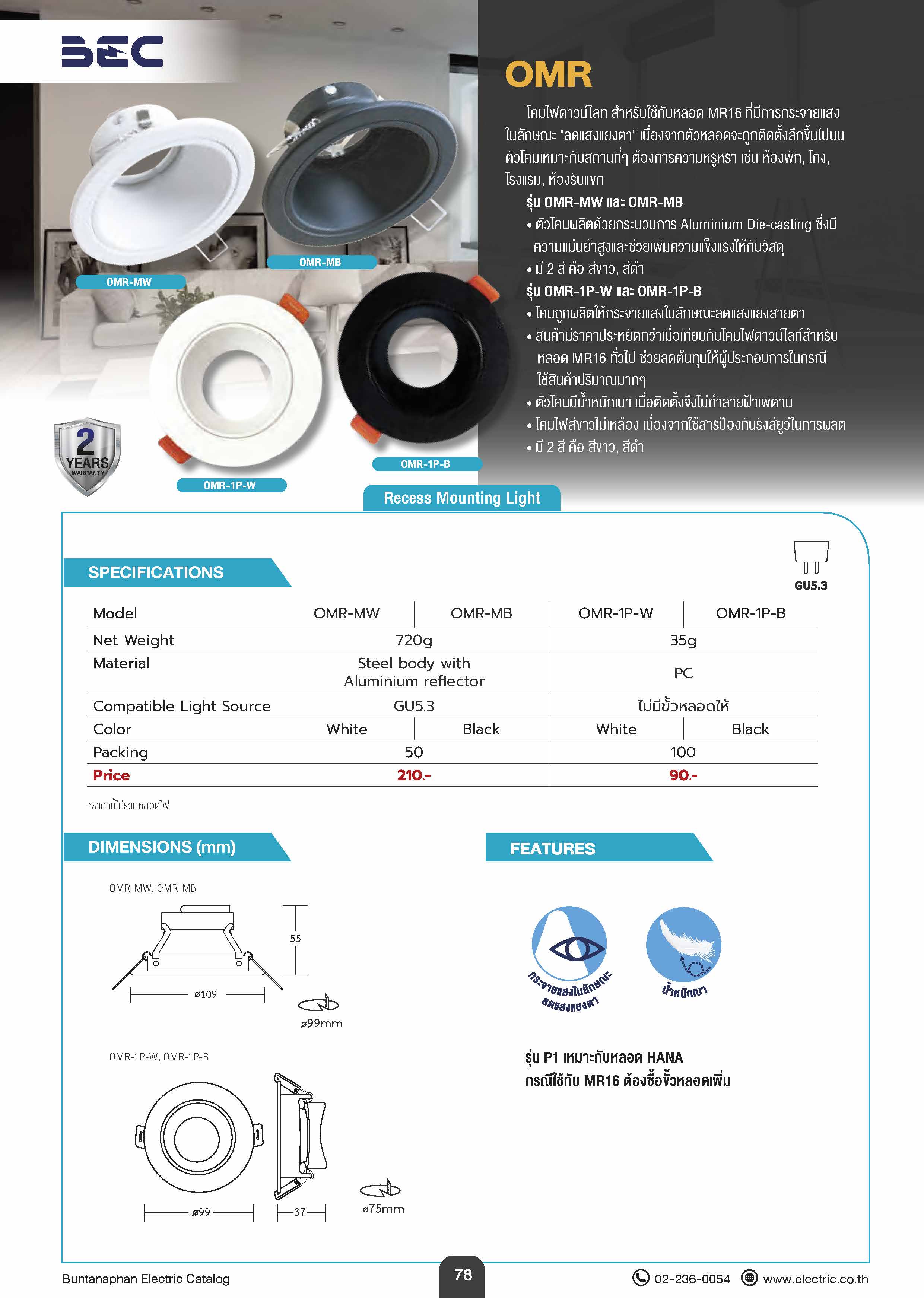 โคมไฟดาวน์ไลท์ สำหรับใช้กับหลอด MR16 ที่มีการกรกระจายแสงในลักษณะ "ลดแสงแยงตา" เนื่องจากตัวหลอดจะถูกติดตั้งลึกขึ้นไปบนตัวโคมเหมาะกับสถานที่ๆ ต้องการความหรูหรา เช่น ห้องพัก, โถง,โรงแรม, ห้องรับแขก รุ่น OMR-MW และ OMR-MB
