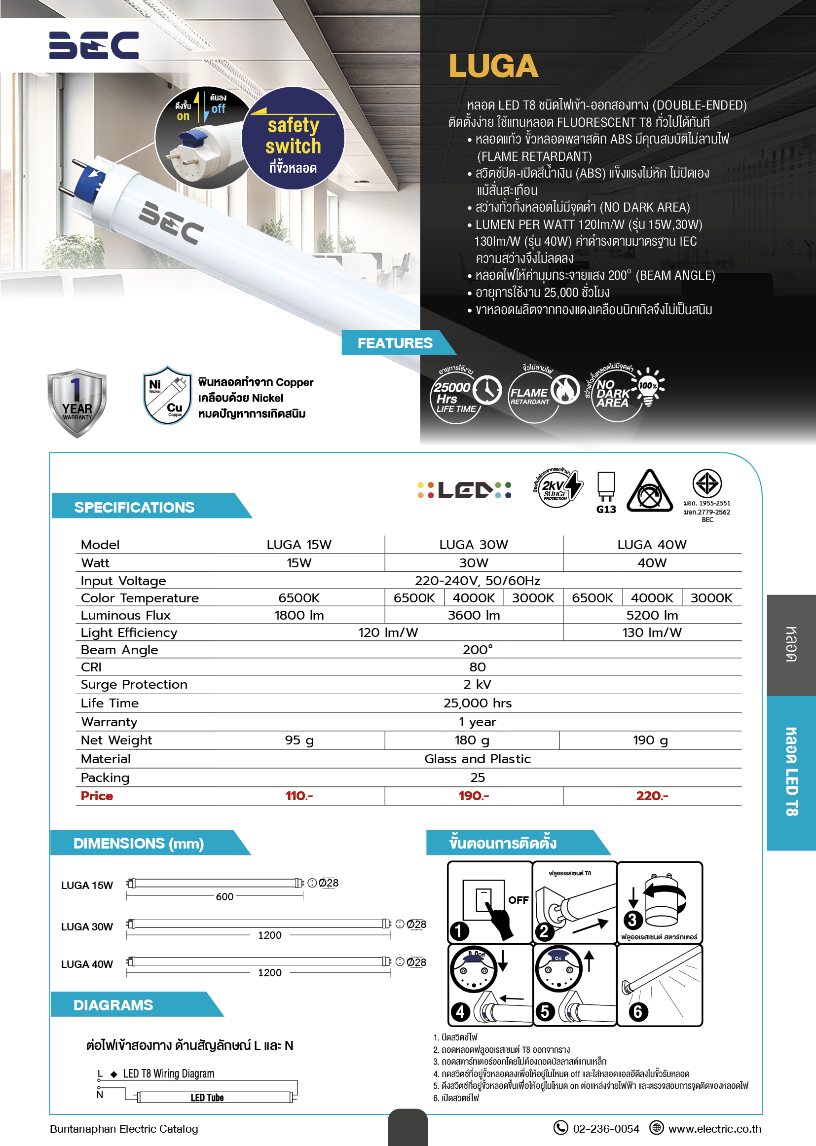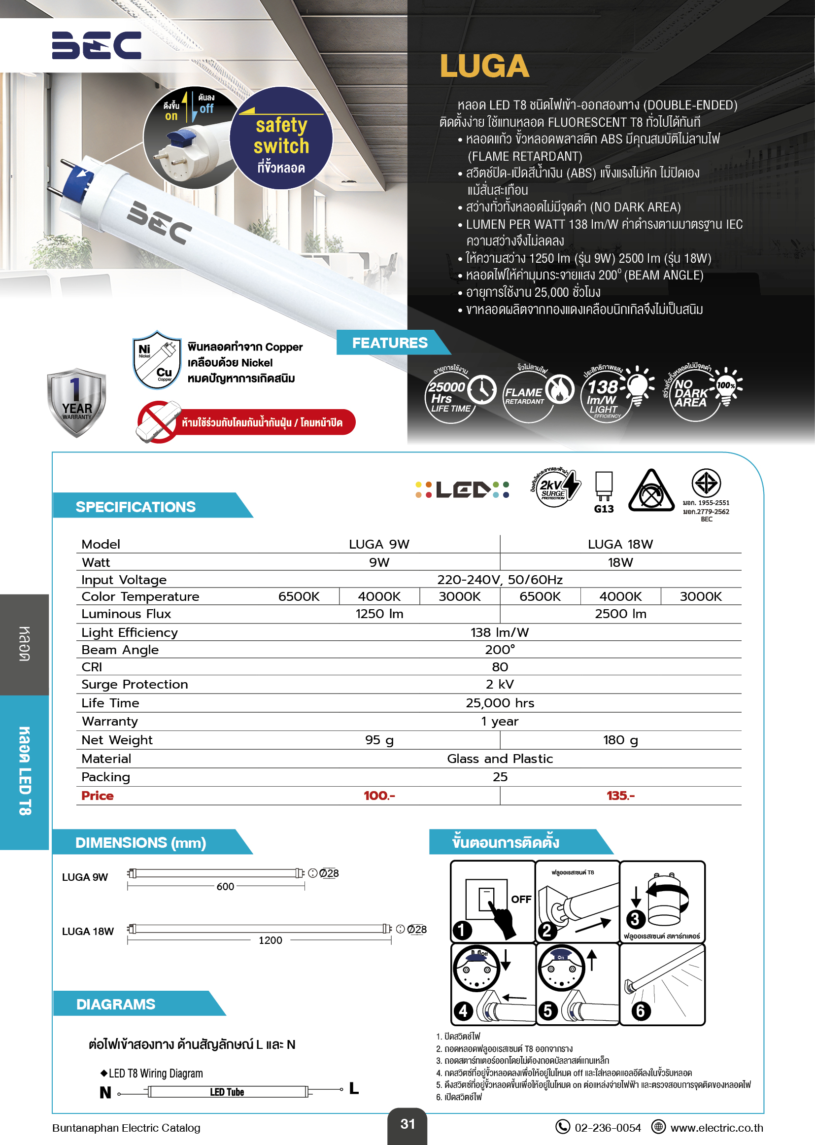 หลอด LED T8 ชนิดไฟเข้า-ออกสองทาง Luga