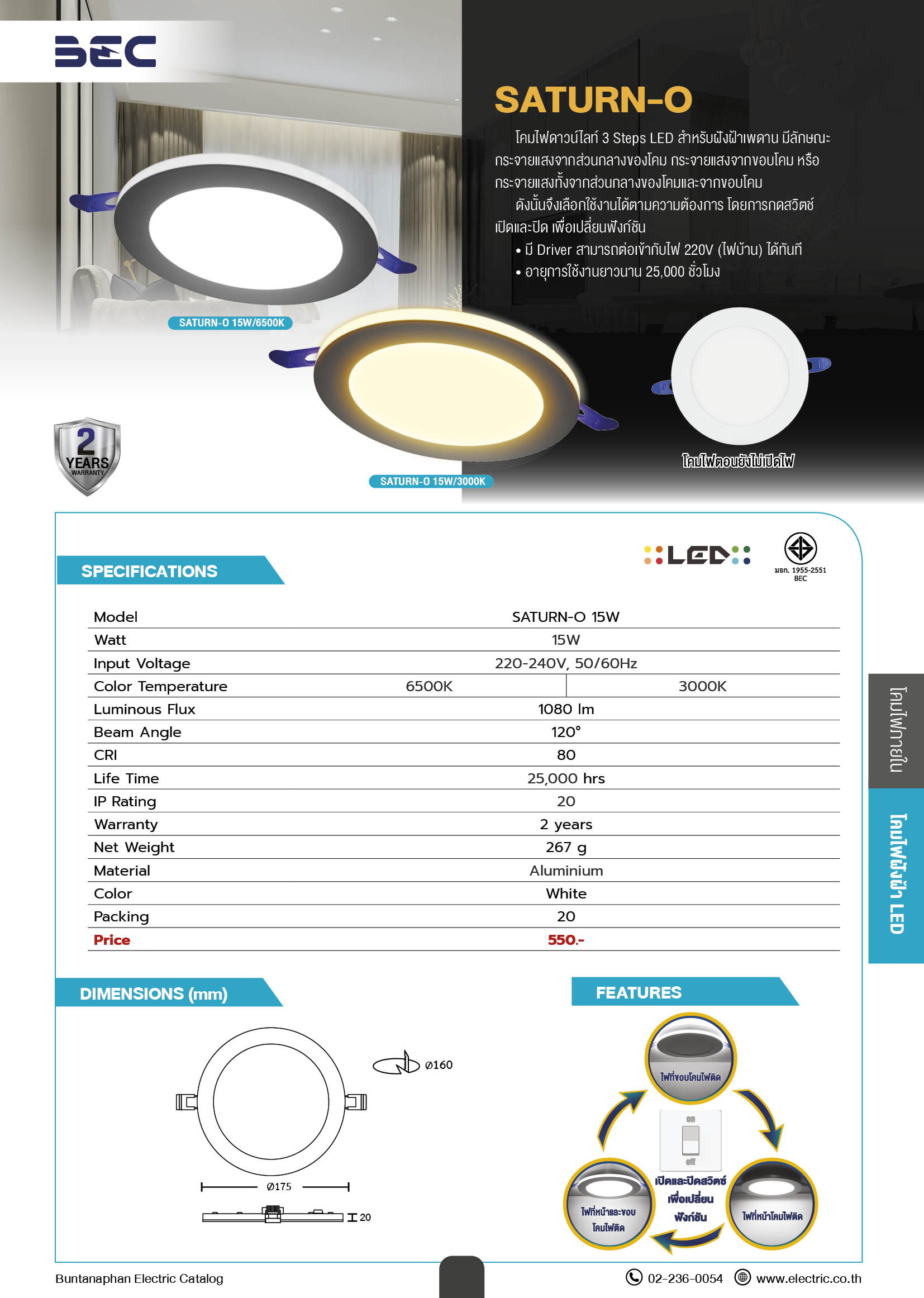 โคมไฟดาวน์ไลท์ 3 Steps LED สำหรับฝังฟ้าเพดาน รุ่น SATURN-O