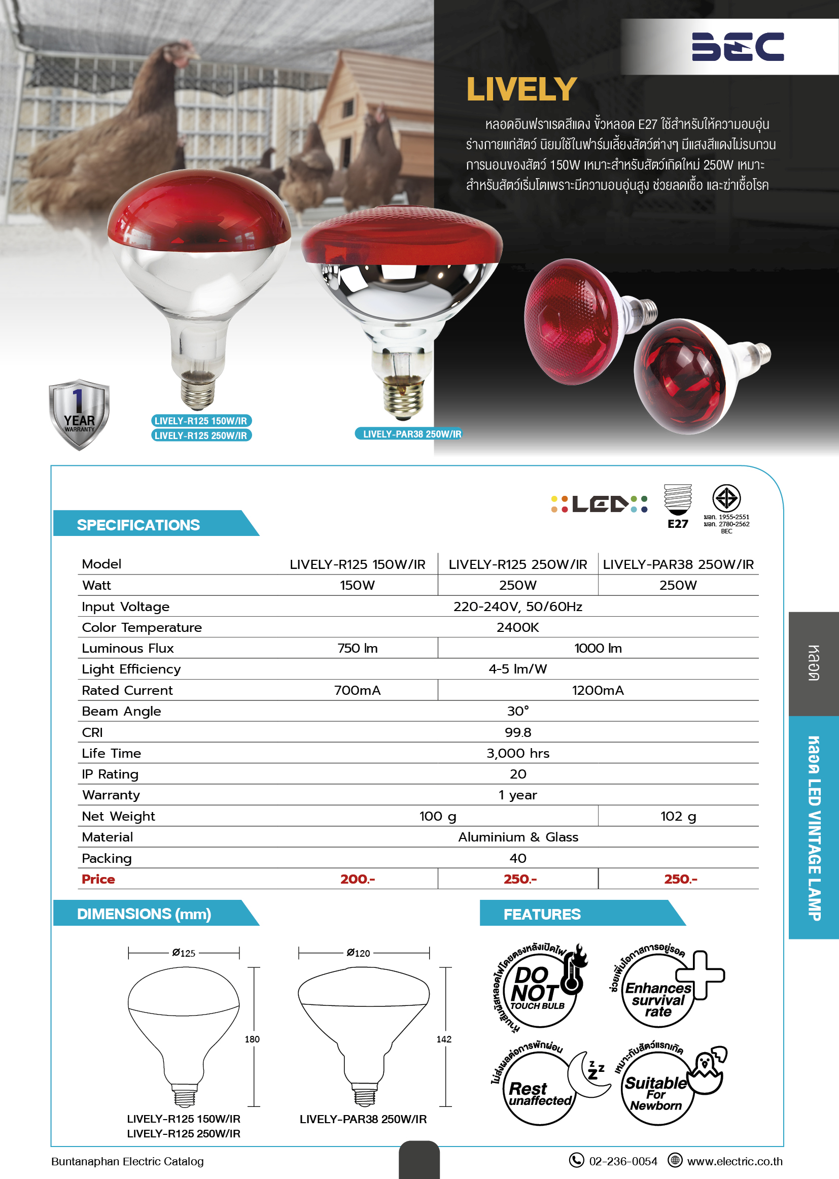 หลอดอินฟราเรดสีแดง ขั้วหลอด E27 รุ่น LIVELY