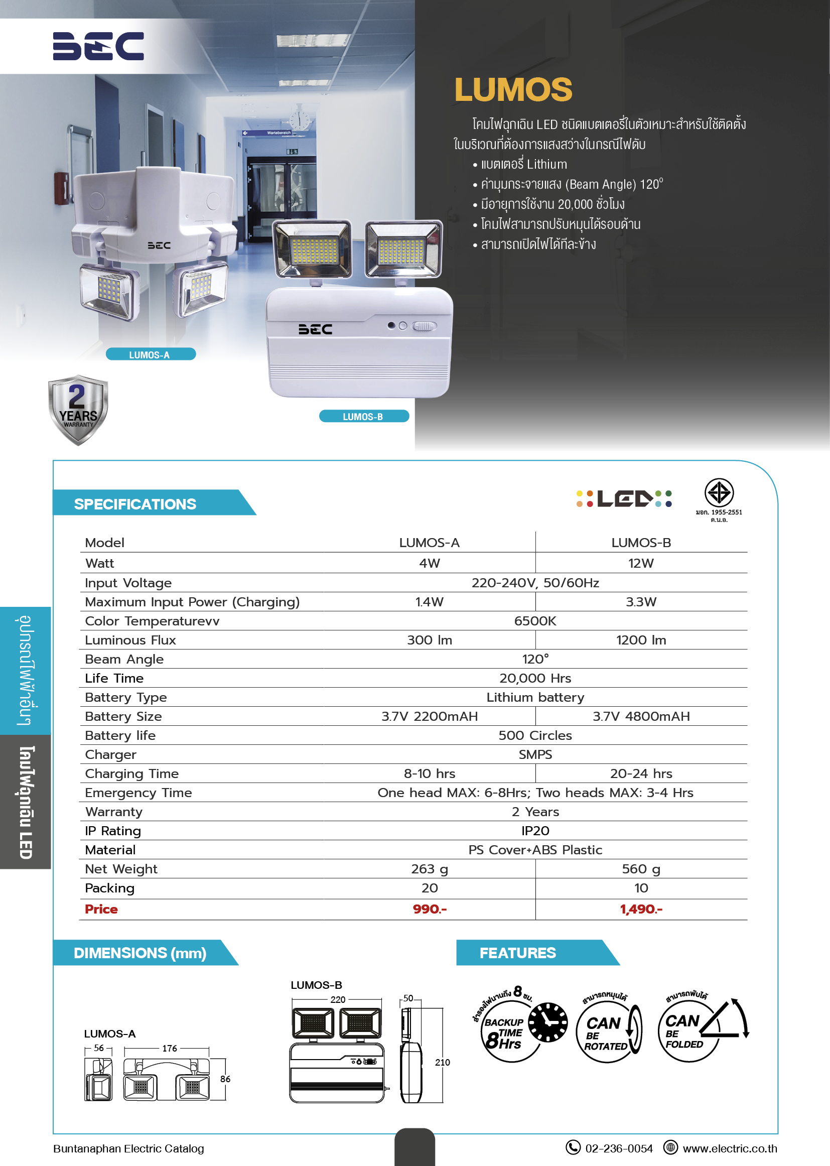 โคมไฟฉุกเฉิน LED ชนิดแบตเตอรี่ในตัว รุ่น LUMOS